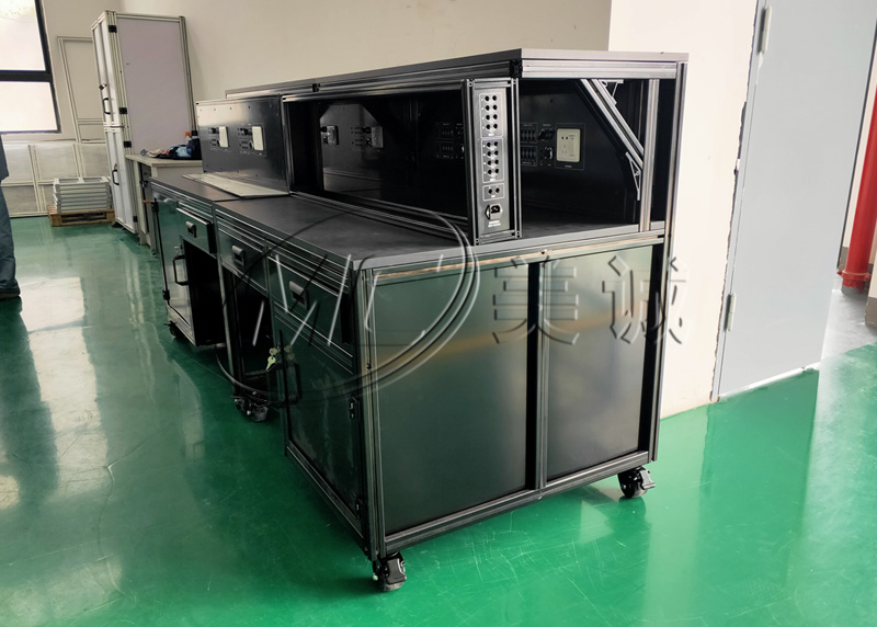 電氣操作臺是專門用來操作電氣工具或者電氣方面零部件組裝等作業(yè)的一種工作臺柜子,也屬于鋁型材框架的一種非常規(guī)制品。美誠定制的這種電氣操作臺是單工位工作臺,左邊是鋁合金柜子可以存放物品,右邊可以坐單人作業(yè)。用黑色氧化表面的鋁合金型材定制電氣操作臺、防腐耐磨并且高端大氣。那么這款既有顏值又有價值的電氣操作臺是如何定制的呢?